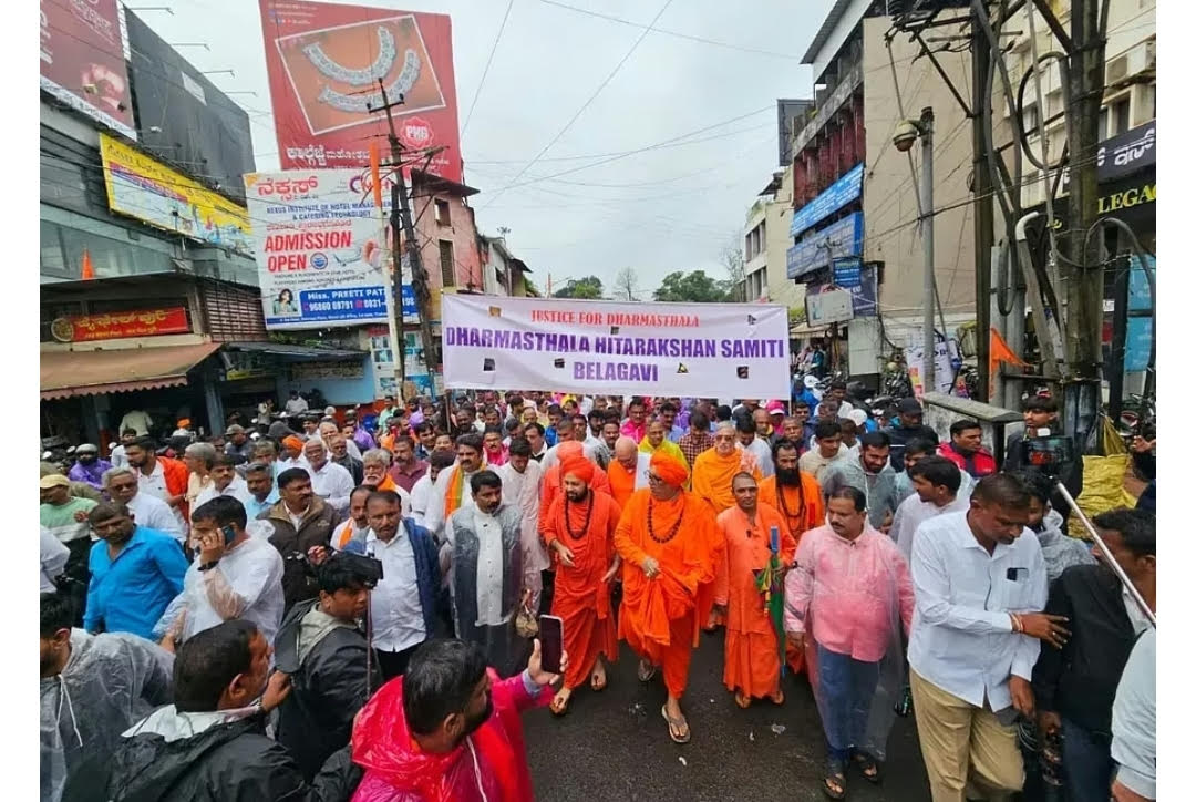 ಬೆಳಗಾವಿ, 19: ಧಾರ್ಮಿಕ ಕ್ಷೇತ್ರ ಧರ್ಮಸ್ಥಳದ ಬಗ್ಗೆ ಅಪಪ್ರಚಾರ ಖಂಡಿಸಿ ಧರ್ಮಸ್ಥಳ ಹಿತರಕ್ಷಣಾ ಸಮಿತಿ ನೇತೃತ್ವದಲ್ಲಿ ಧಾರಾಕಾರ ಮಳೆಯನ್ನೂ ಲೆಕ್ಕಿಸದೇ ಹಿಂದೂ ಸಮಾಜದ ಮುಖಂಡರು ನಗರದಲ್ಲಿ ಮಂಗಳವಾರ ತೀವ್ರ ಪ್ರತಿಭಟನೆ ನಡೆಸಿದರು.